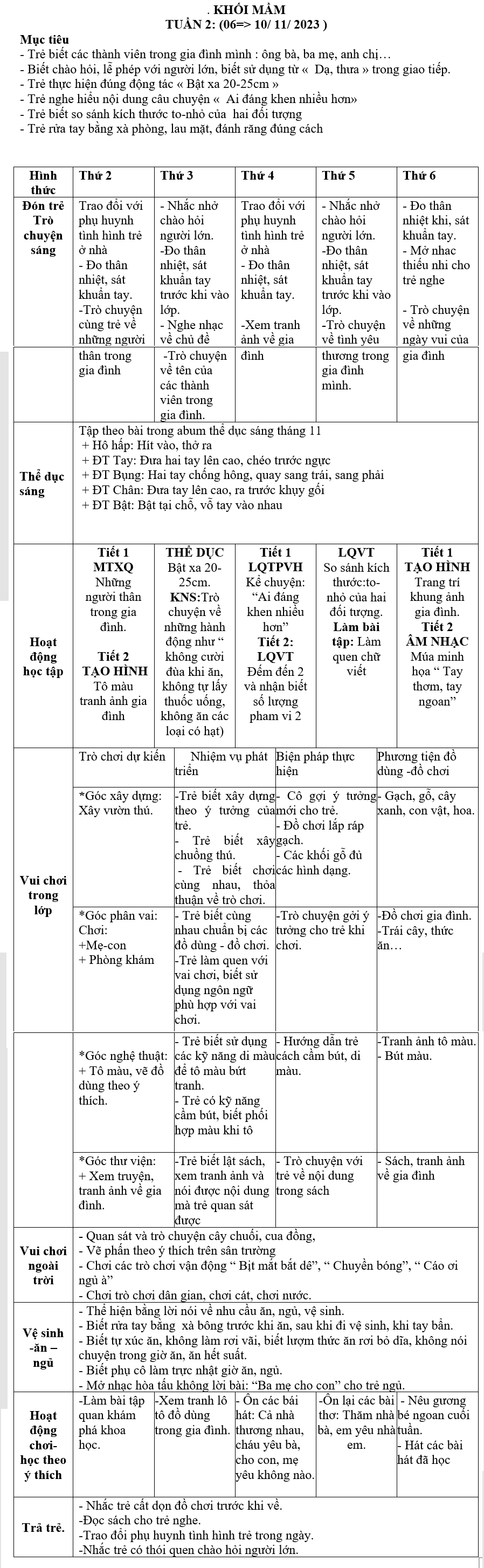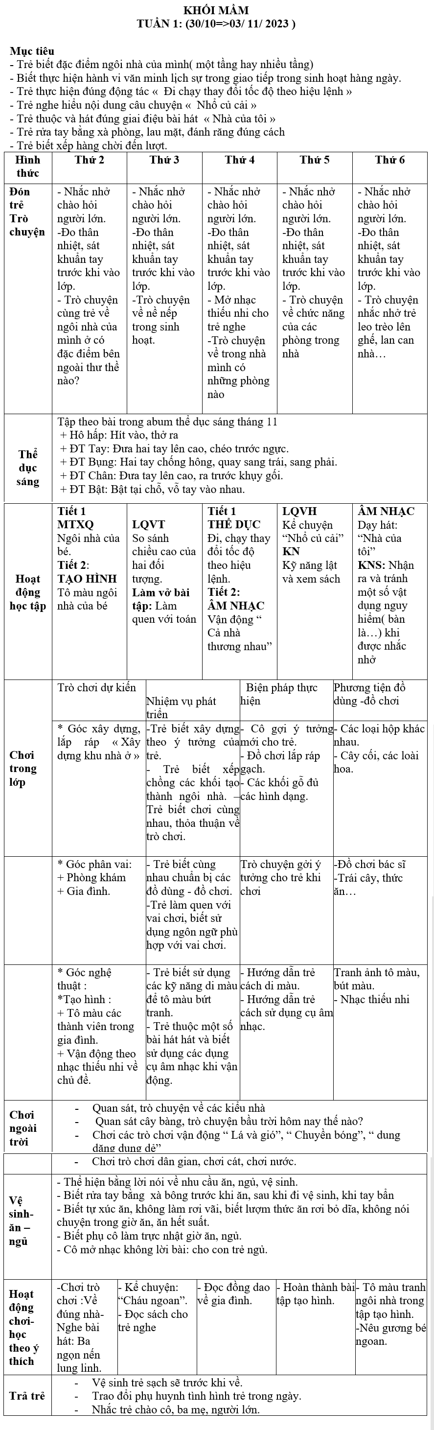 KHỐI MẦM: KẾ HOẠCH GIÁO DỤC tháng 09-2023