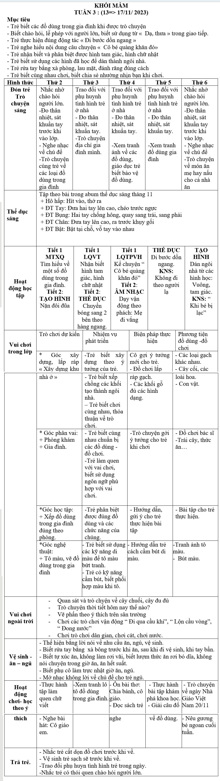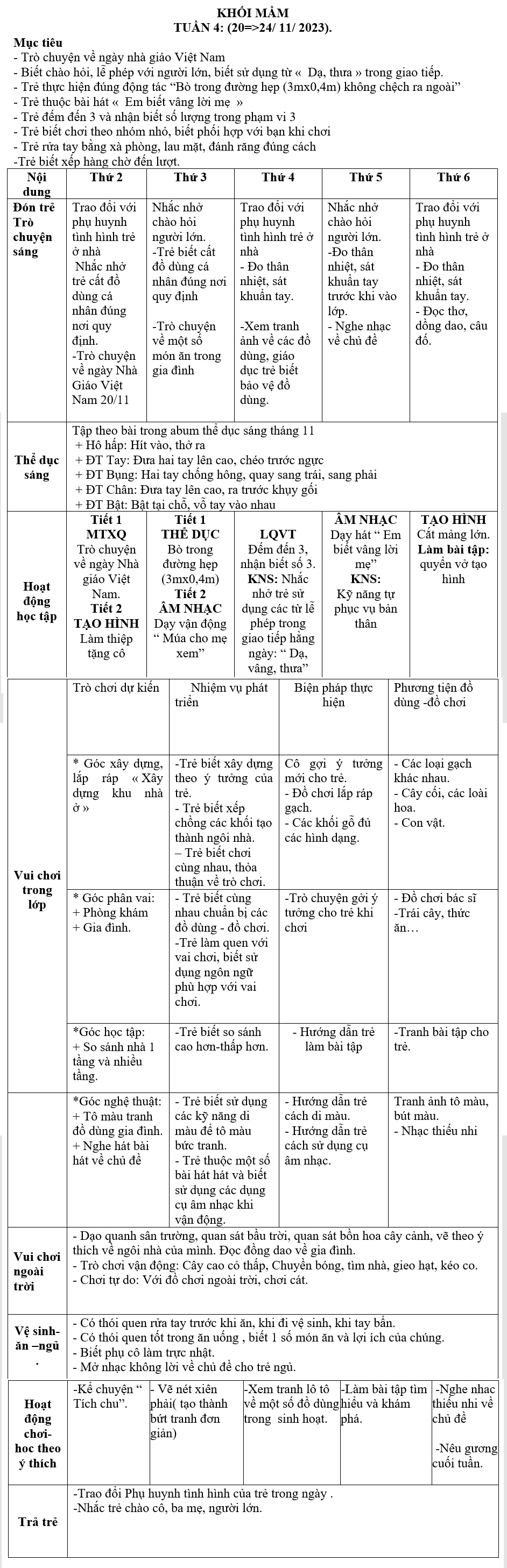 KHỐI MẦM: KẾ HOẠCH GIÁO DỤC tháng 11-2023 TRƯỜNG MẦM NON HOA HỒNG ĐỎ TP THỦ ĐỨC