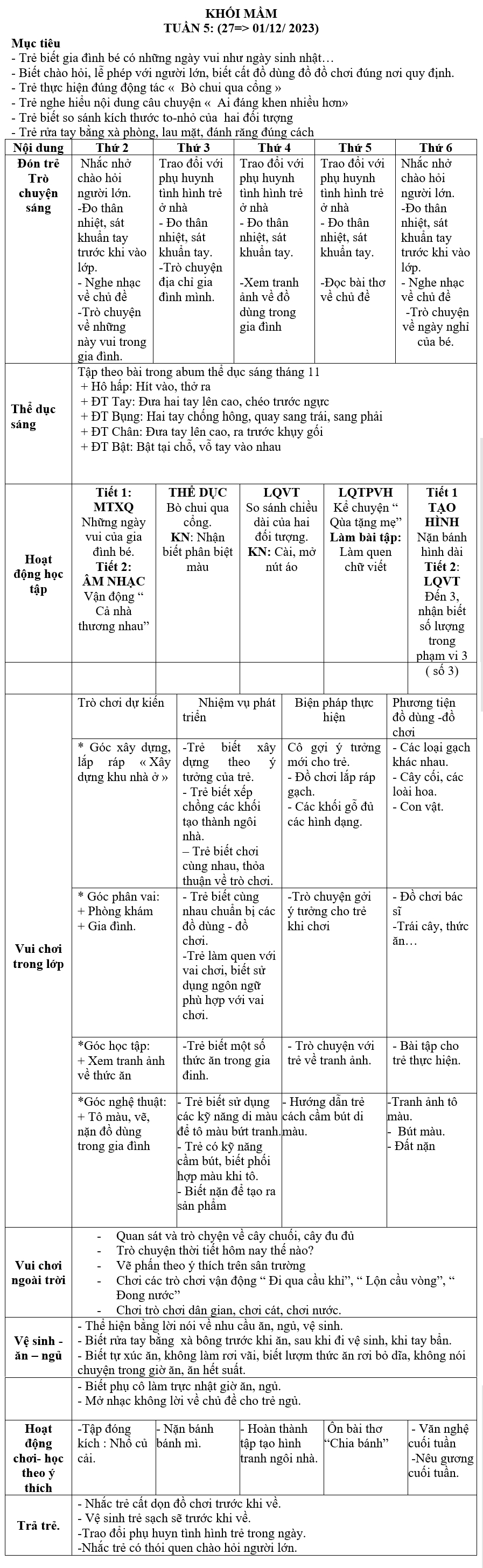 KHỐI MẦM: KẾ HOẠCH GIÁO DỤC THÁNG 01-2023