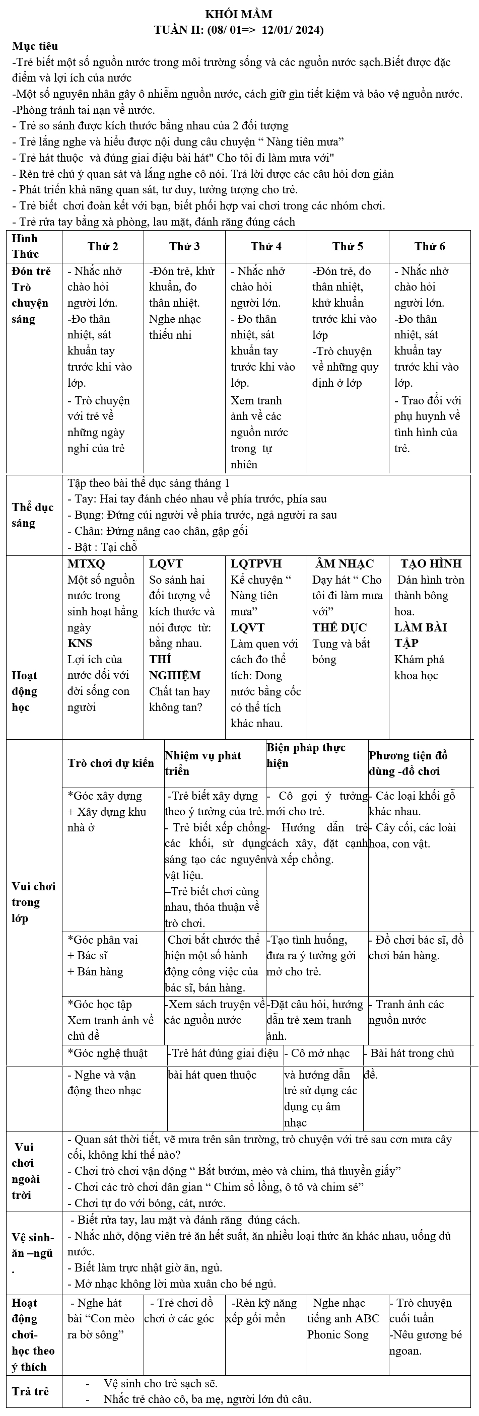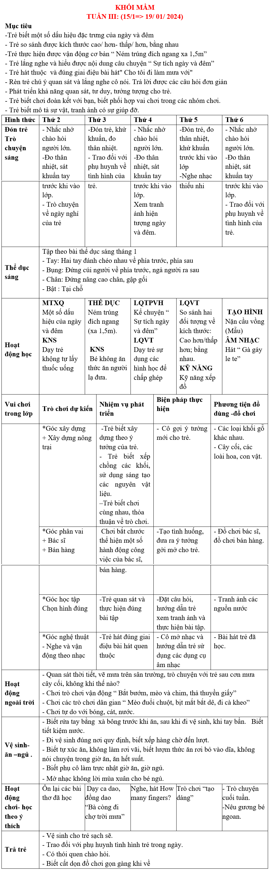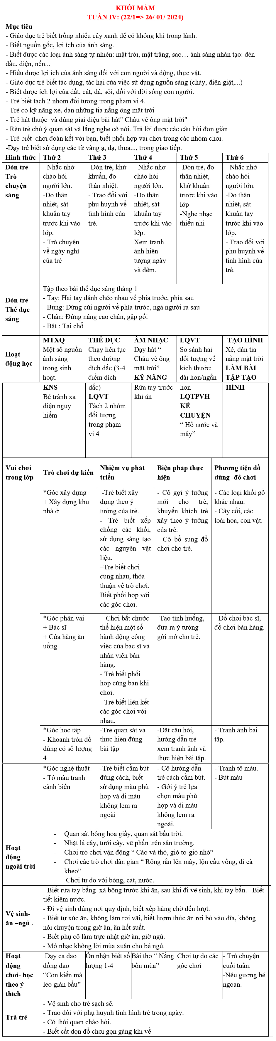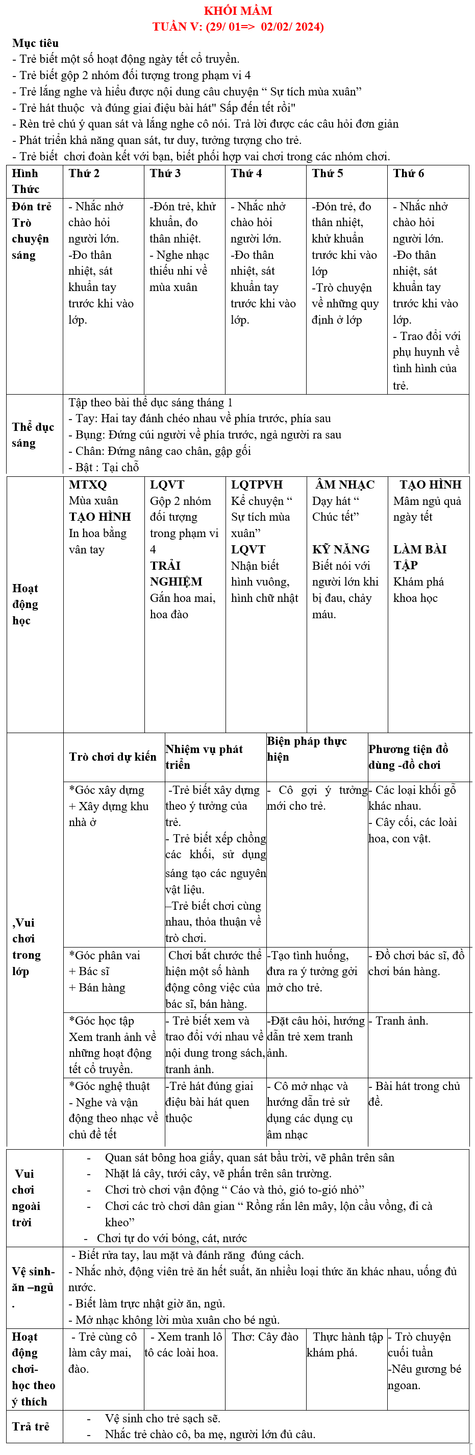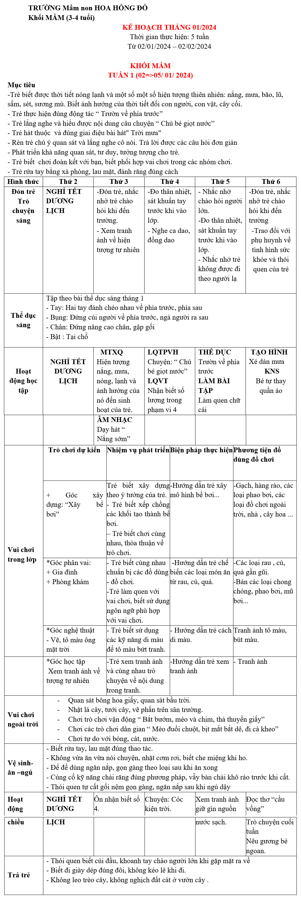KHỐI MẦM: KẾ HOẠCH GIÁO DỤC tháng 01-2024 TRƯỜNG MẦM NON HOA HỒNG ĐỎ TP THỦ ĐỨC