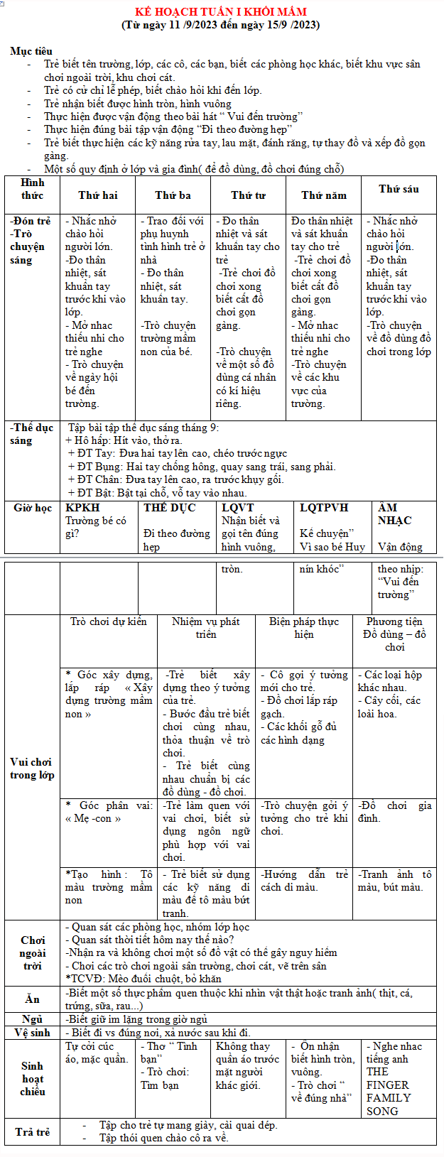 KẾ HOẠCH TUẦN I KHỐI MẦM