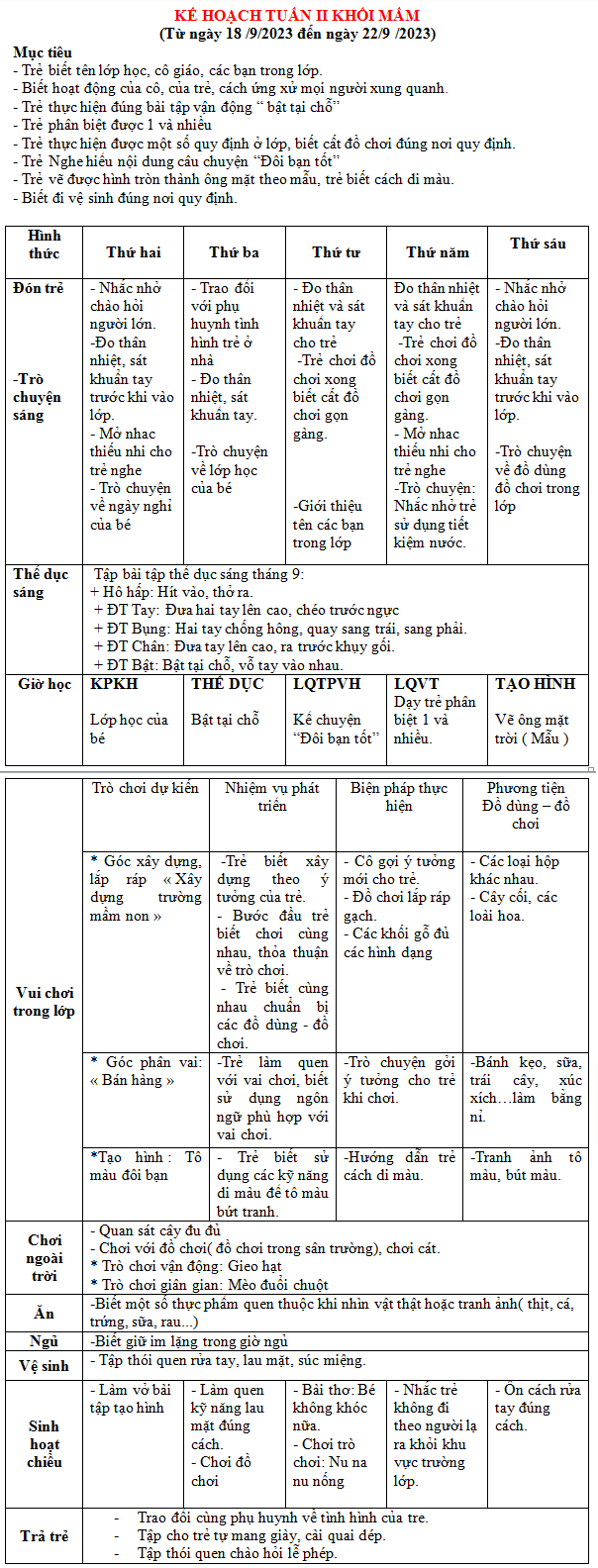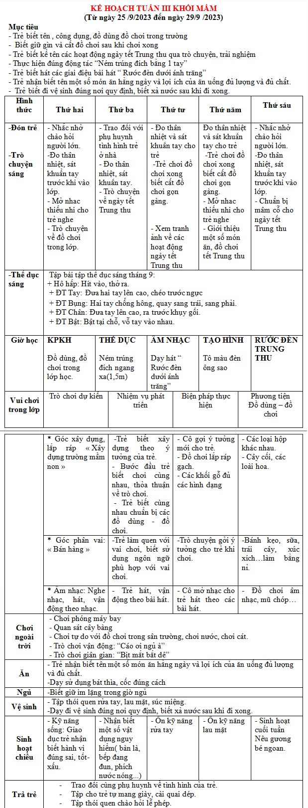 KẾ HOẠCH THÁNG 9 KHỐI MẦM
