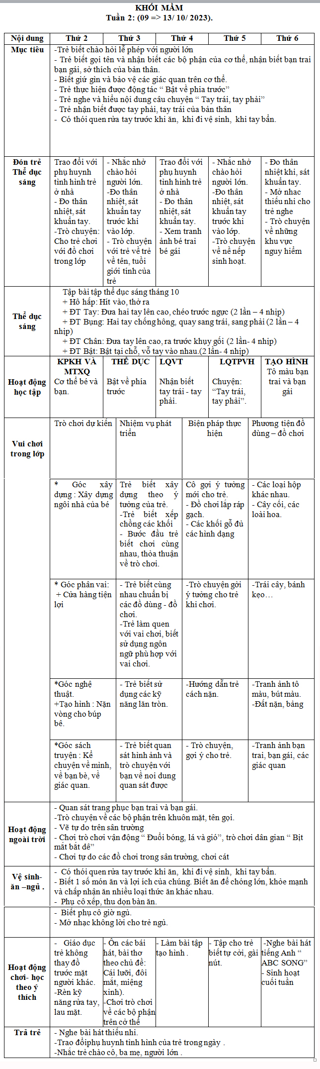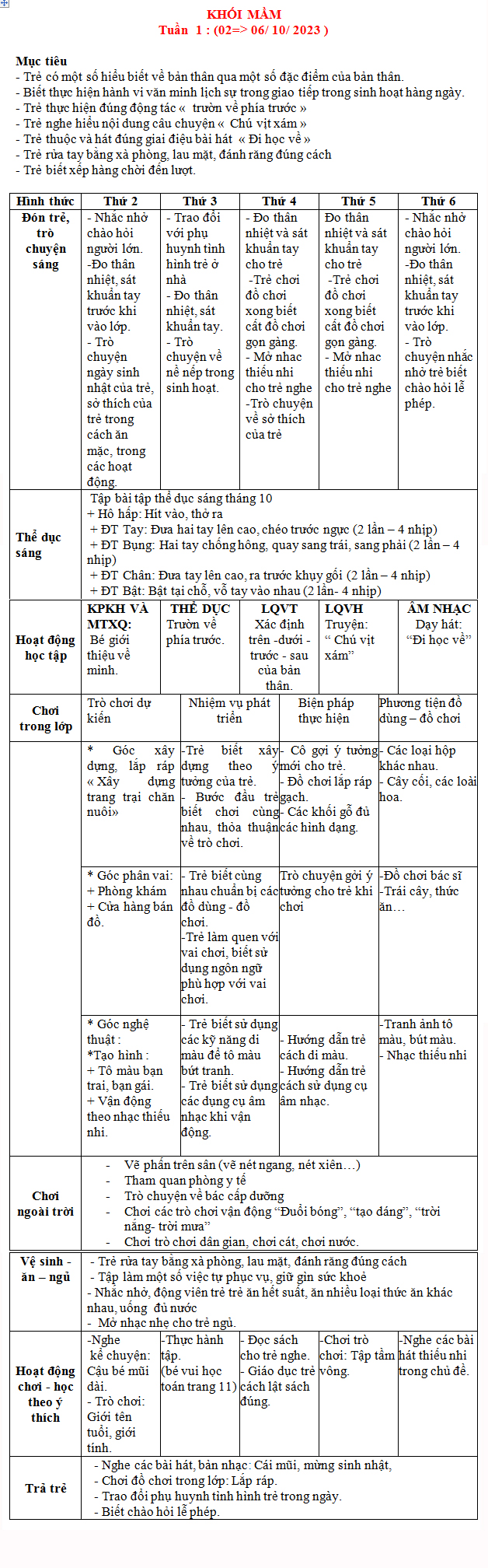 KHỐI MẦM: KẾ HOẠCH GIÁO DỤC tháng 09-2023