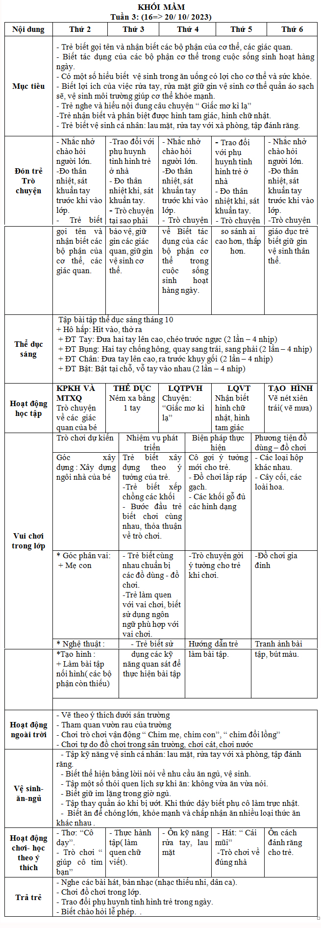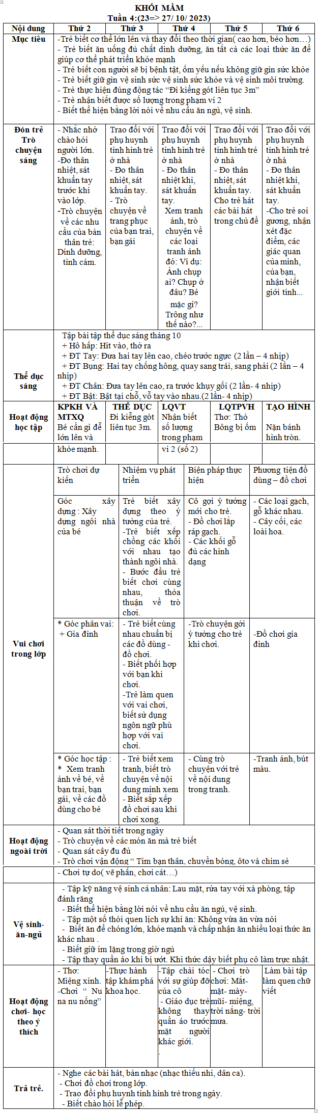 KHỐI MẦM: KẾ HOẠCH GIÁO DỤC tháng 10-2023