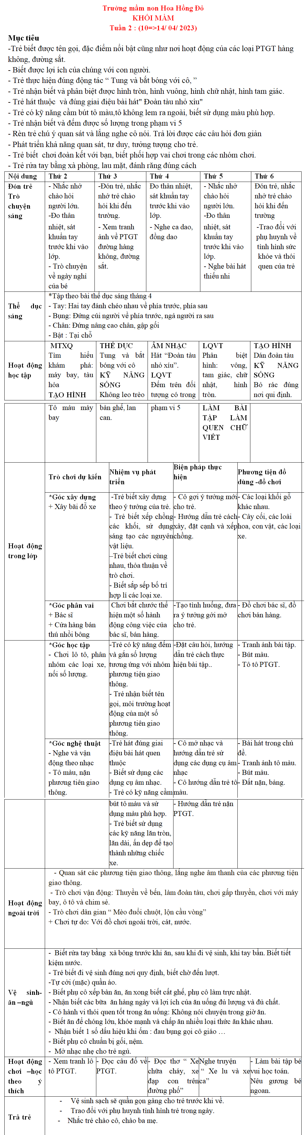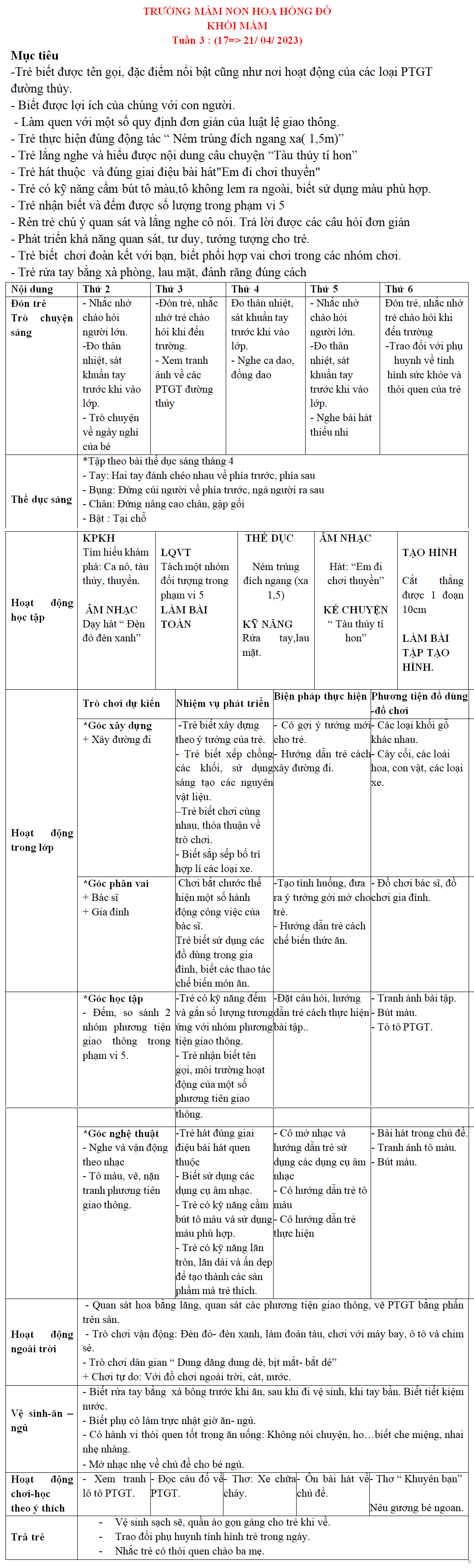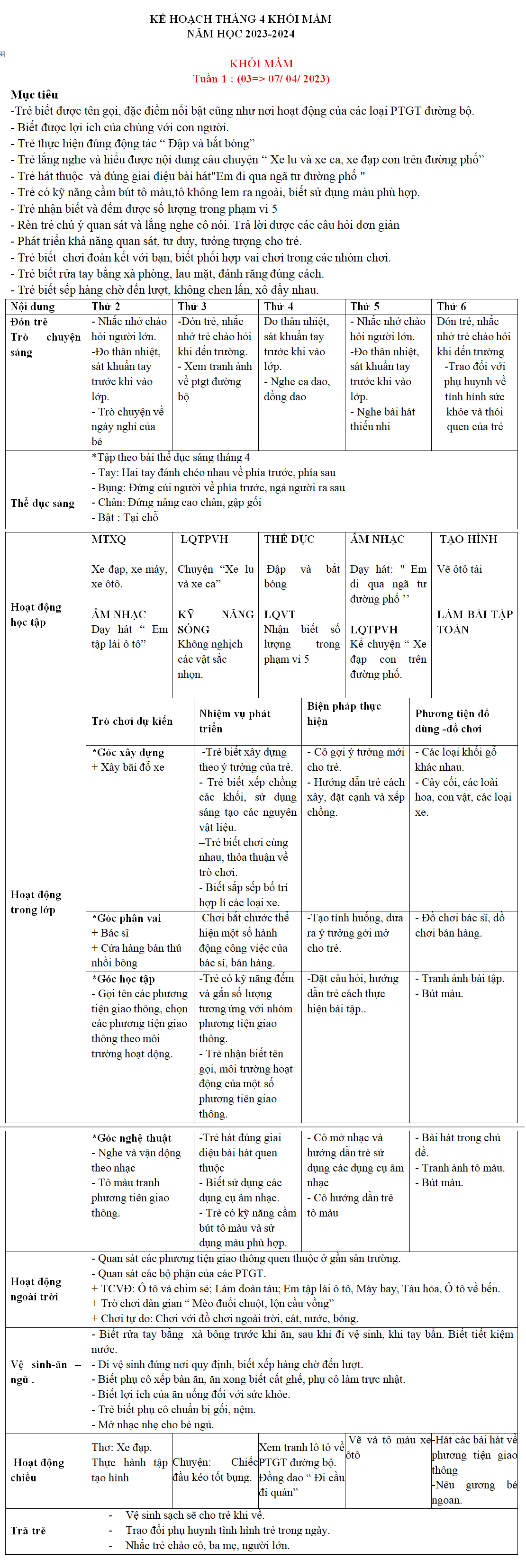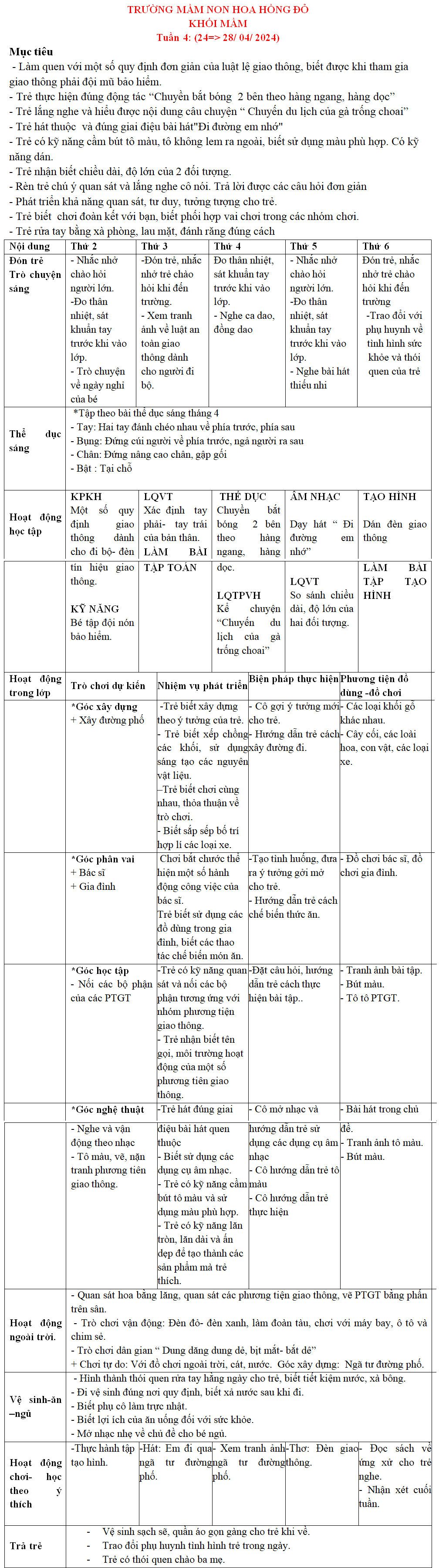 KHỐI MẦM: KẾ HOẠCH GIÁO DỤC tháng 04-2024 TRƯỜNG MẦM NON HOA HỒNG ĐỎ TP THỦ ĐỨC